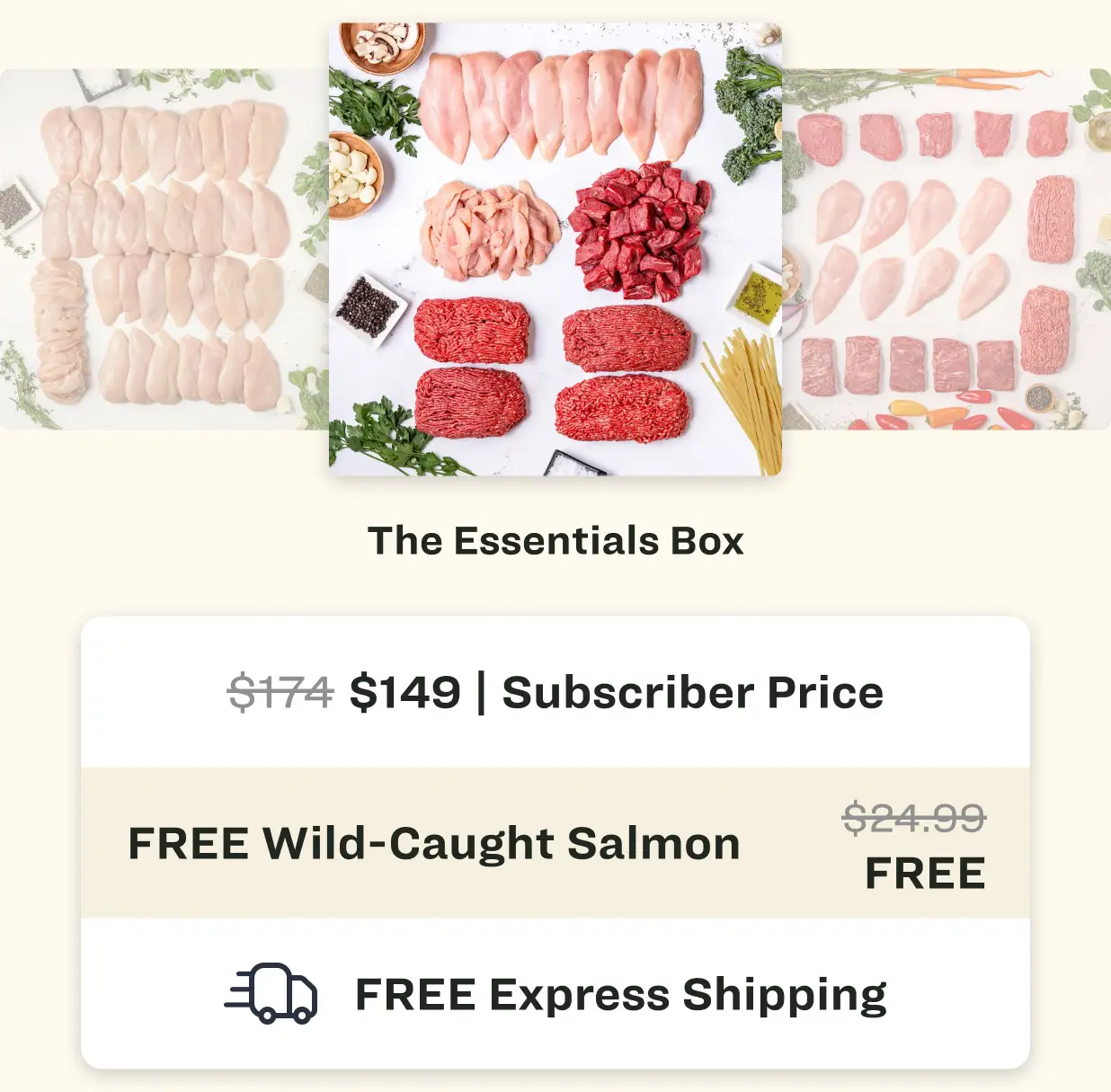 Subscribe and get $25 off every box, free express shipping, and free protein with every delivery.